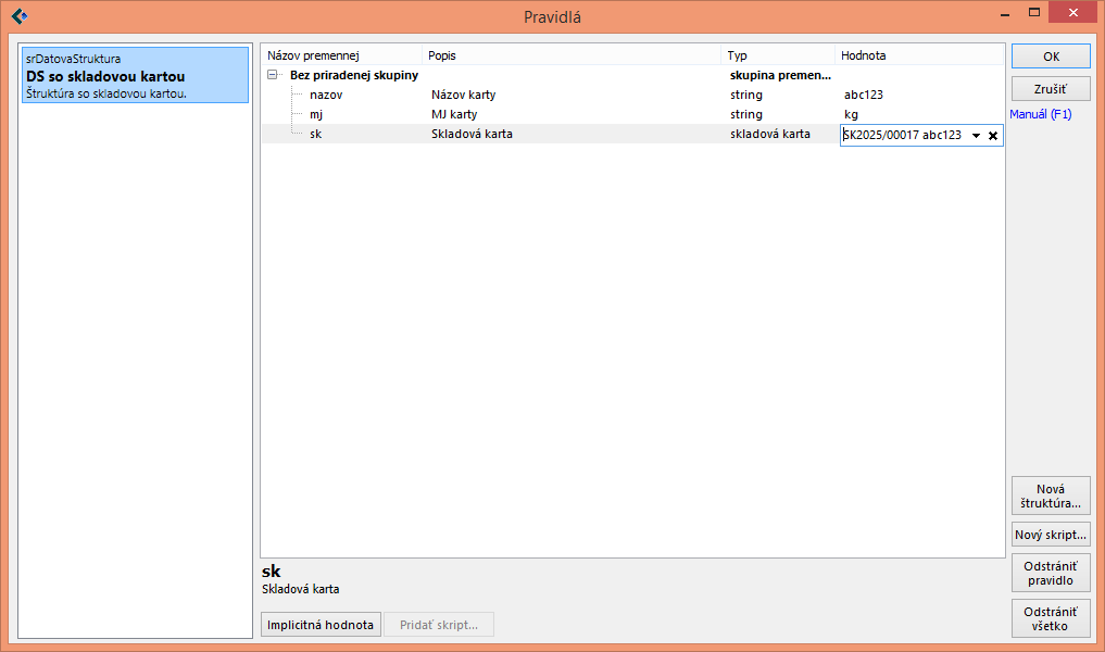 Dátové štruktúry sa dajú používať na niektorých dialógoch. Na týchto dialógoch nájdete alebo tlačidlo Pravidlá, alebo funkciu Akcie/Pravidlá/Zobraziť pravidlá. Na dialógu Pravidlá si môžete pridať dátovú štruktúru a vypĺňať v nej údaje.