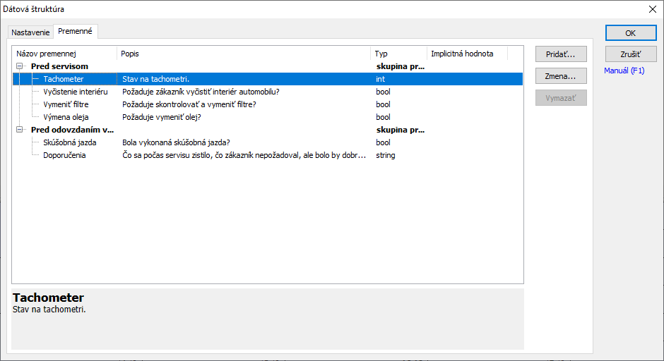 Predstavte si, že ste malý autoservis a v spisoch si evidujete servisovanie vozidiel. Okrem bežných údajov si potrebujete ku každému servisu doplniť aj niekoľko požadovaných údajov. Údaje máte kvôli prehľadnosti rozdelené na dve skupiny: